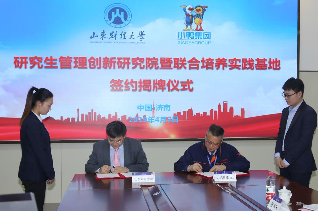 2019年4月3日下午,山东财经大学与山东小鸭集团共建研究生管理创新研究院和联合培养实践基地签约、揭牌仪式在山东小鸭集团举行。校长赵忠秀,济南市国资委副主任谢红兵,山东小鸭集团董事长、总经理李永刚出席。小鸭集团相关部门负责人,学校校长办公室、研究生院负责人参加活动。