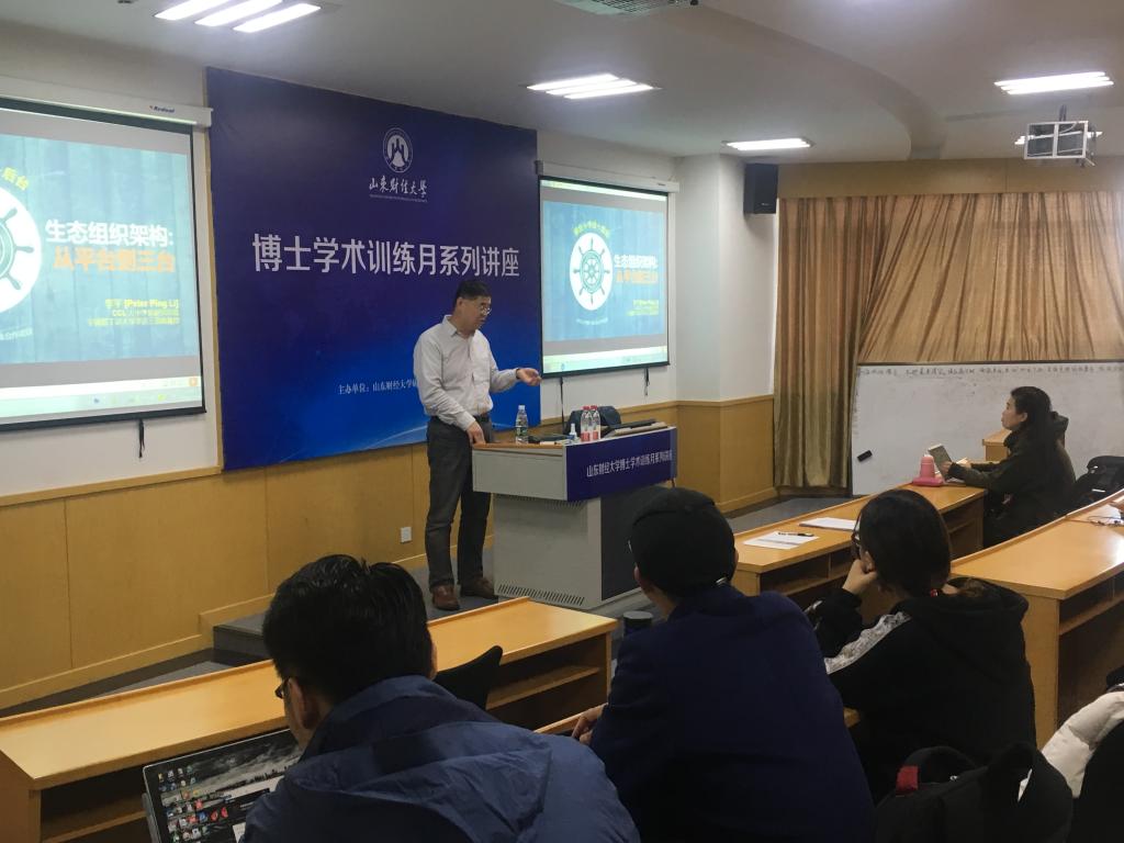11月19日上午,宁波诺丁汉大学国际企业管理领域李达三首席教授,美国创新领导力中心(CCL)大中华区研究总监,丹麦哥本哈根商学院中国企业管理领域终身正教授Peter Ping Li受邀莅临我校博士学术训练月活动,在舜耕校区为博士和硕士研究生做了题为《未来组织架构:从平台到三台》的学术报告。报告会由研究生院副院长杨明海主持,我校相关学科博士、硕士研究生参加活动。