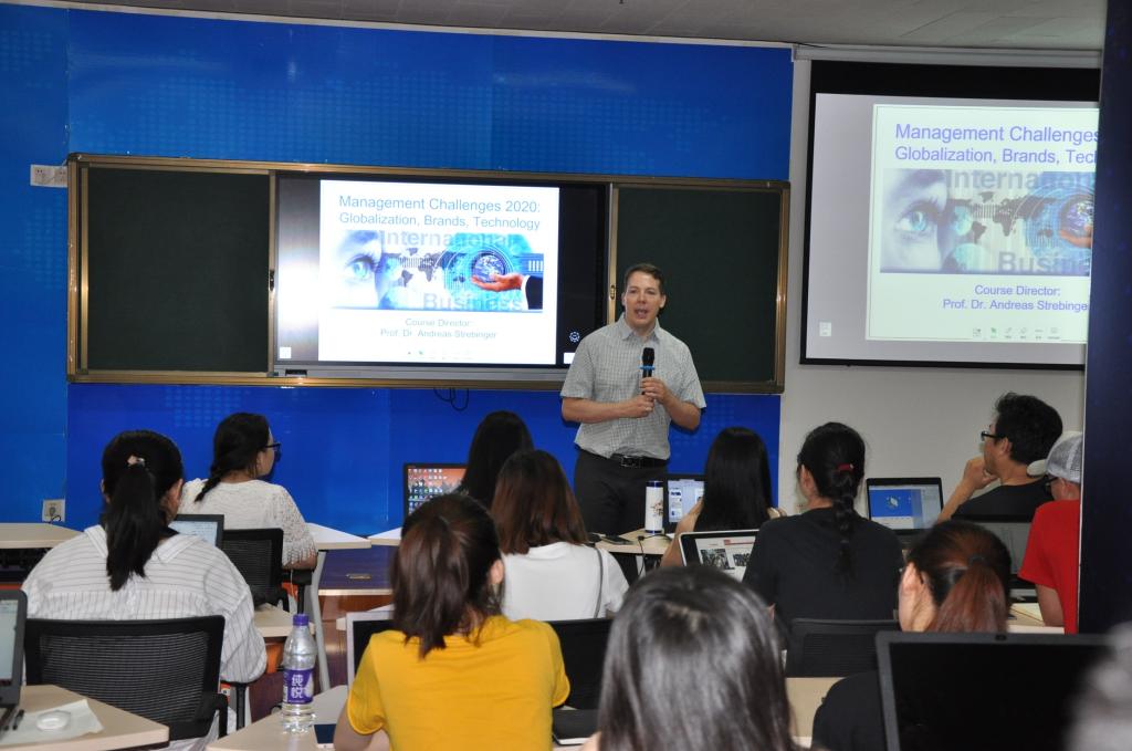 课程正式开始后,Andreas Strebinger教授以《Management Challenges 2020: Globalization, Brands, Technology》为主题,以国际化的教学模式,为研究生们带来了一场学术盛宴,以其在专业领域长期积累的科研成果和教学经验,通过演讲、PPT展示、分组讨论、口头汇报、探索性作业布置等,在悉心传授管理学前沿知识的同事,注重提高同学们的英语交流和表达能力。