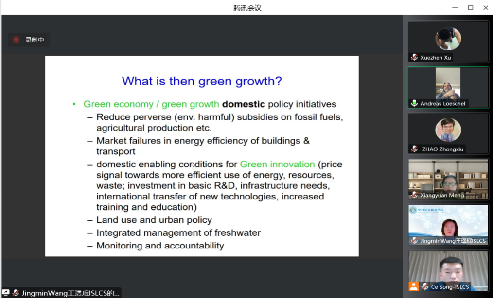 会上,吕安迪讲解了绿色增长的含义、实现路径、如何克服金融危机、对国内政策以及全球国家的倡议。吕安迪重点强调应减少对化石燃料、农业生产等的不正当或有害的补贴,不可持续的补贴会严重阻碍绿色经济的发展。为消除绿色增长的障碍,促进发展轨迹的转变,吕安迪提出了一种市场工具(如碳定价、碳排放交易的控制工具等)和非市场工具(反馈、社会比较等)的政策组合。