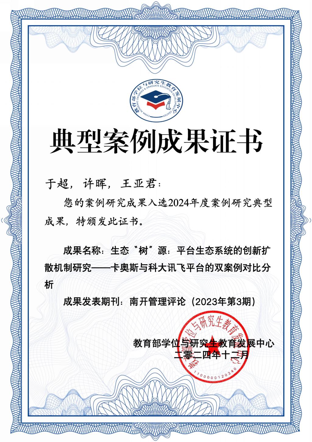 近日,教育部学位与研究生教育发展中心发布2024年度典型案例成果名单,我校工商管理学院青年教师于超(第一作者)及其合作者发表在《南开管理评论》2023年第3期的论文《生态“树”源:平台生态系统的创新扩散机制研究——卡奥斯与科大讯飞平台的双案例对比分析》获评“案例研究典型成果”。