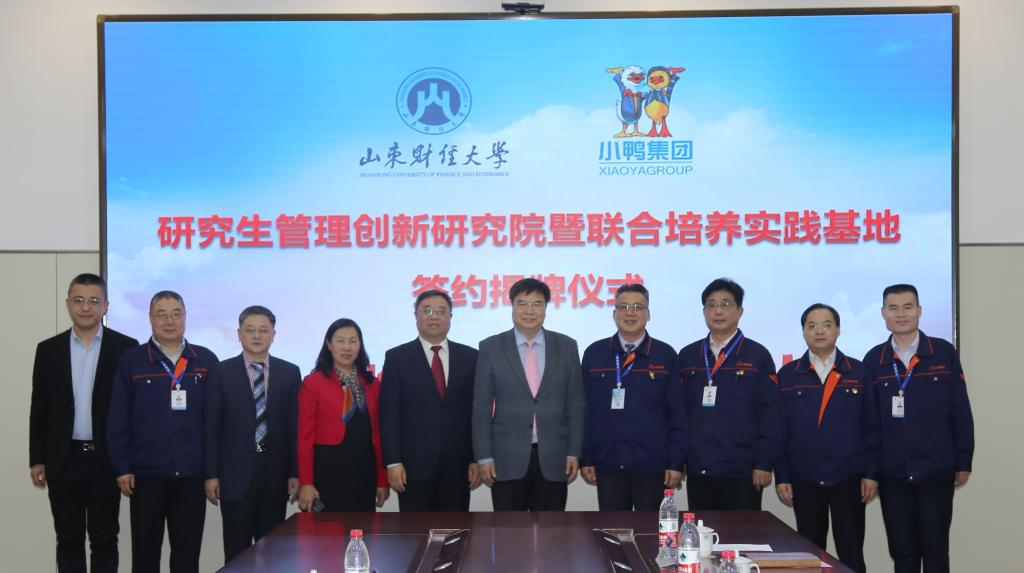 2019年4月3日下午,山东财经大学与山东小鸭集团共建研究生管理创新研究院和联合培养实践基地签约、揭牌仪式在山东小鸭集团举行。校长赵忠秀,济南市国资委副主任谢红兵,山东小鸭集团董事长、总经理李永刚出席。小鸭集团相关部门负责人,学校校长办公室、研究生院负责人参加活动。
